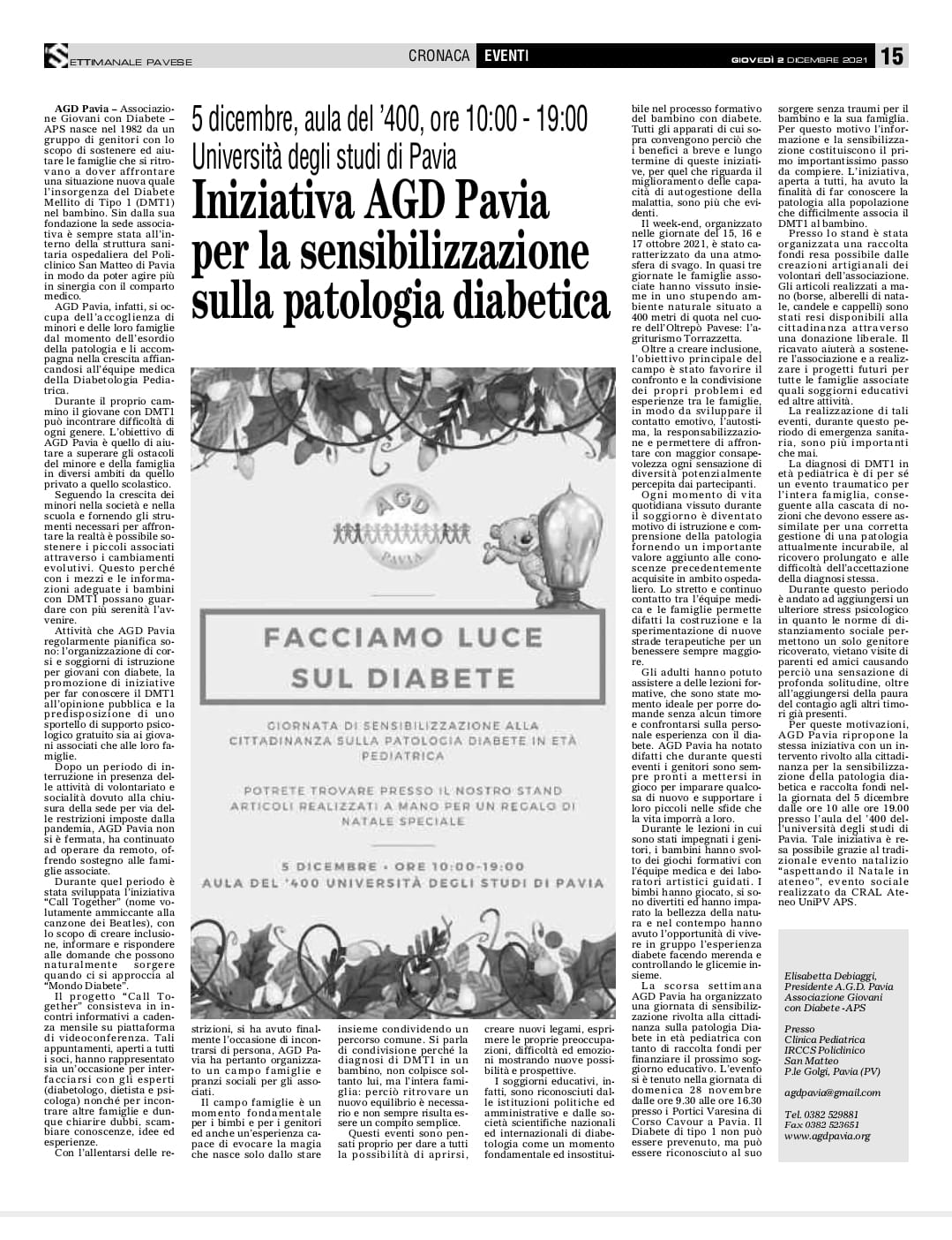 AGD Pavia ripropone l’iniziativa del 28 novembre volta a informare e a sensibilizzare la popolazione sul Diabete Mellito di Tipo 1 nel bambino. L’evento si terrà nella giornata di Domenica 5 Dicembre dalle ore 10:00 alle ore 19:00 presso l‘aula del ‘400 dell’università degli studi di Pavia. Tale iniziativa è resa possibile grazie al tradizionale evento natalizio “aspettando il Natale in ateneo”, evento sociale realizzato da CRAL Ateneo UniPV APS.